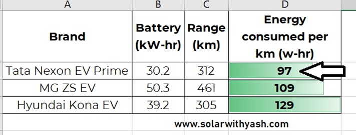 Tata Nexon EV prime consumes the least per km (97 kW-hr) among the three EVs.