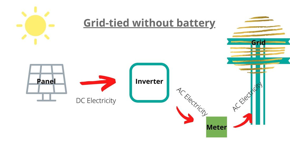 This system produces electricity when the sun shines and stops when sunlight is not available.