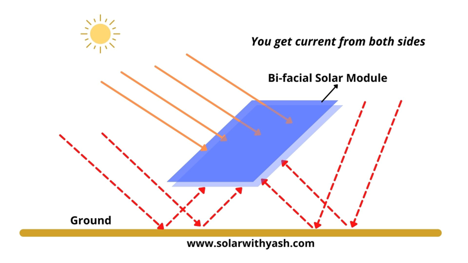 The reflected sunlight from the ground strikes the rear of the bi-facial solar panel.