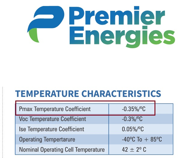 The Premier Energies solar panels have a temperature coefficient of power value of -0.35%/ᴼC.