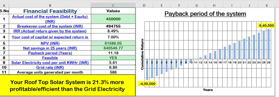 The Solar Feasibility Spreadsheet enables you to design the solar power system and know the financial feasibility within a few minutes of getting inputs from the client.