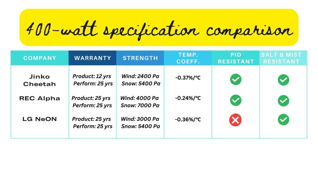Let us look at the value of all 6 specifications of 400-watt solar panels of different companies (Jinko, REC, and LG) in tabular form.