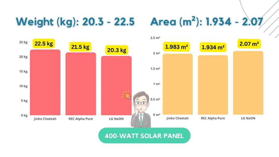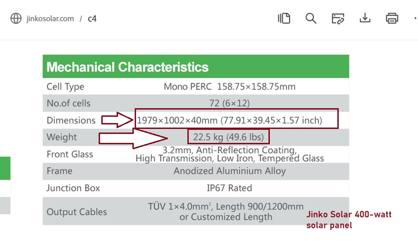 Its area and weight are less than that of the Jinko Solar 400-watt solar panel.