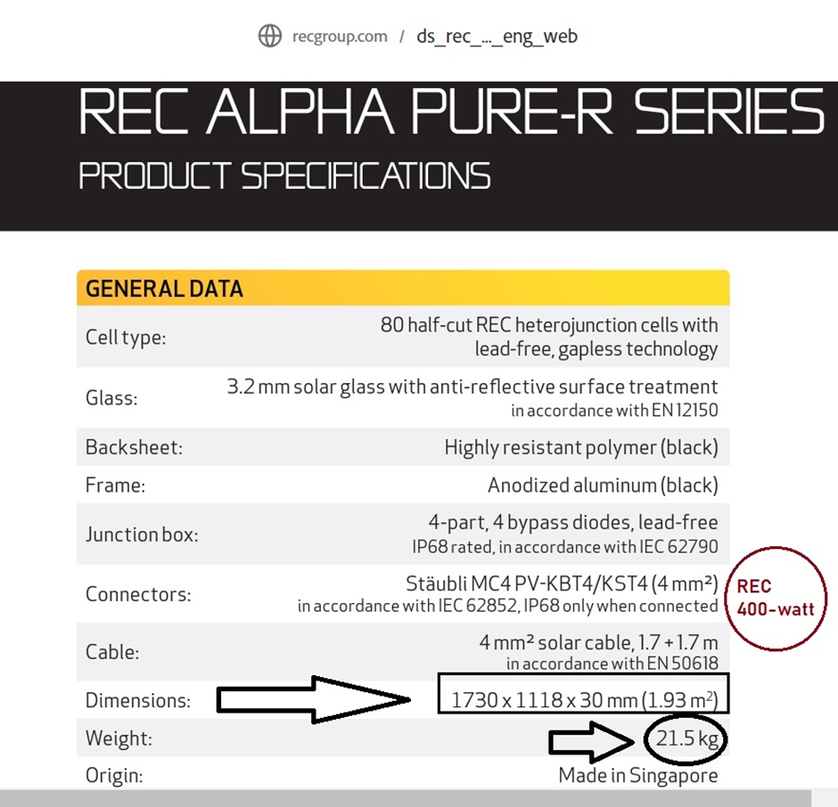 Let us take another company REC Alpha Series with a 400-watt solar panel.