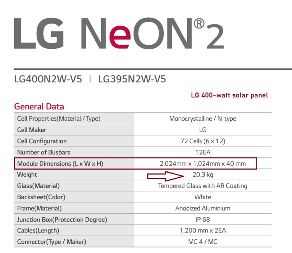 We can summarise our findings about the weight and area of a 400-watt solar panel in the following form: